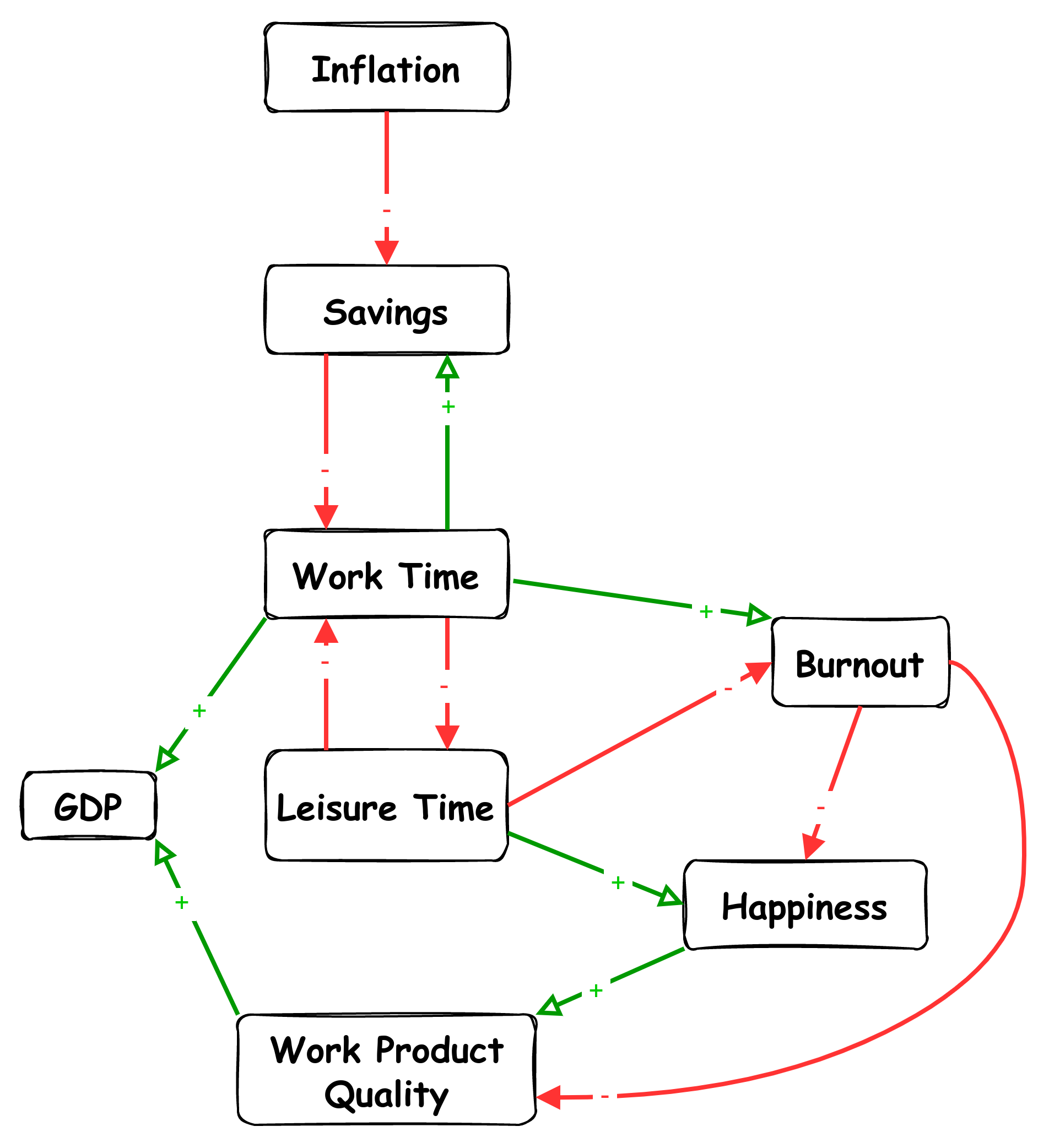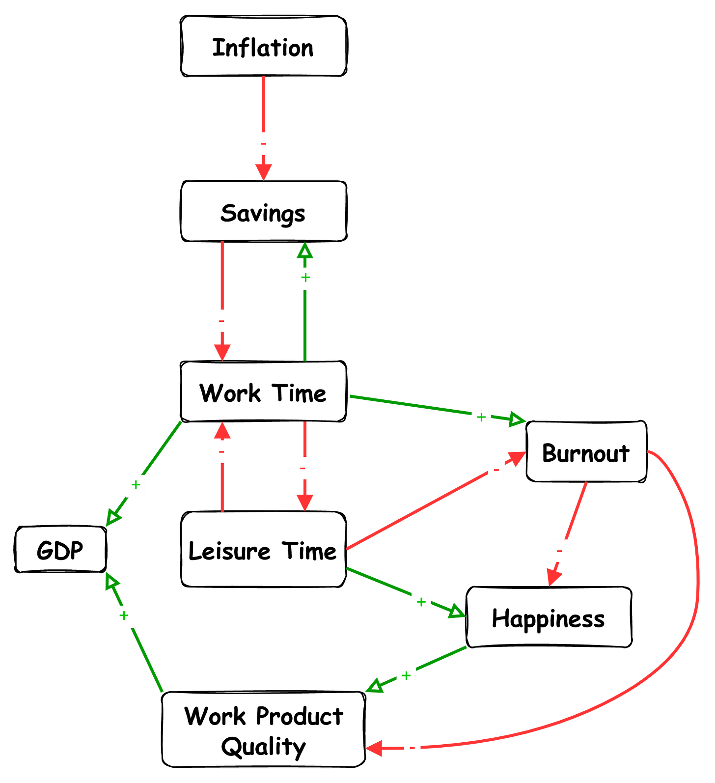 I added a few elements to build out just why people might value their leisure time more than the work needed to pad a saving account. The affect of the pandemic stimulus money reflects the relationships in the causal loop diagram. When the government was putting more money in people’s pockets then they could acquire by working, of course they opted for the happiness and stress-free life of leisure. Human nature wins. Again. The article concludes: