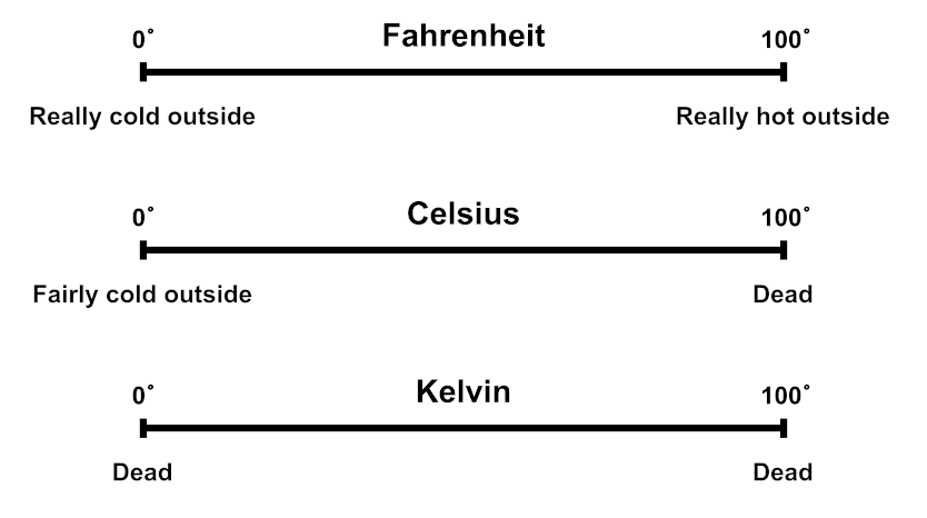 Let’s start with a simple example of measuring temperature. The scale we use can have a significant, even life altering impact on how we prepare for what’s outside. “It’s a hundred degrees outside,” someone tells you. How will you dress before opening the door? That will depend on the temperature scale. Knowing the scale can help with your decision even if you aren’t familiar with the context.