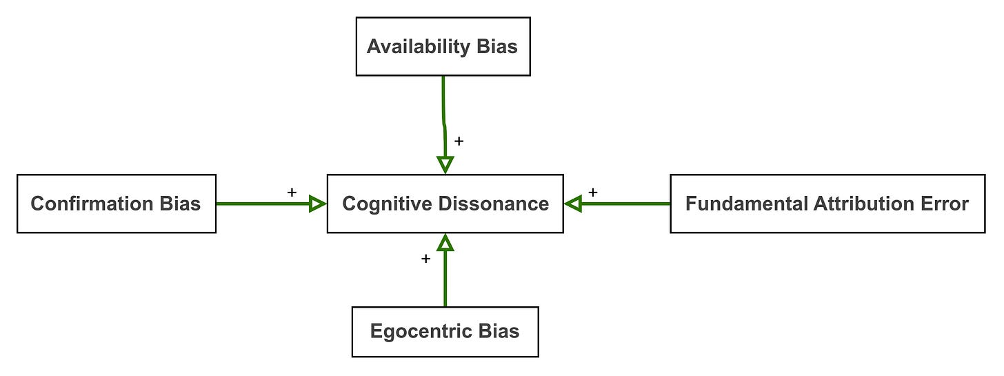 As someone is more and more influenced by the confirmation bias, the potential for cognitive dissonance increases. The more they are influenced by the availability bias, the the potential for cognitive dissonance increases. The same for the egocentric bias and fundamental attribution error. The more someone is influenced by each of these, the greater the potential for cognitive dissonance. Of course, the less someone is influenced by each of these, the potential for cognitive dissonance decreases, but we'll get to the untangling a little later.