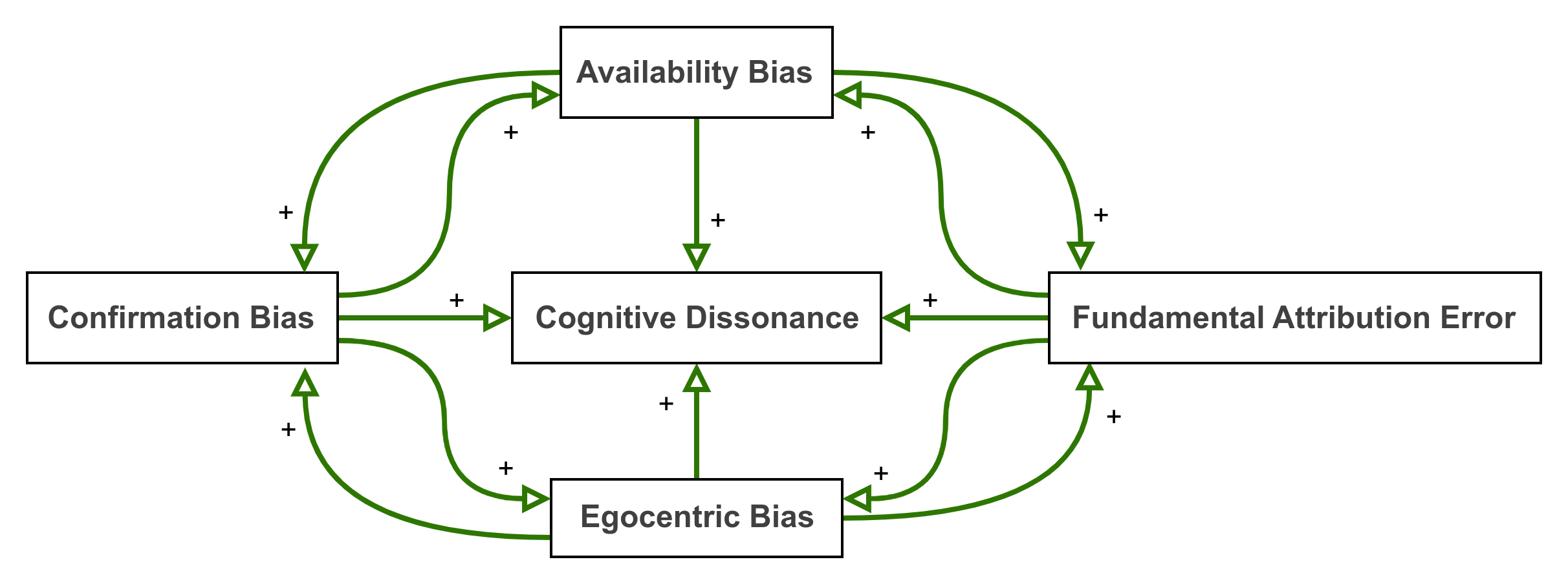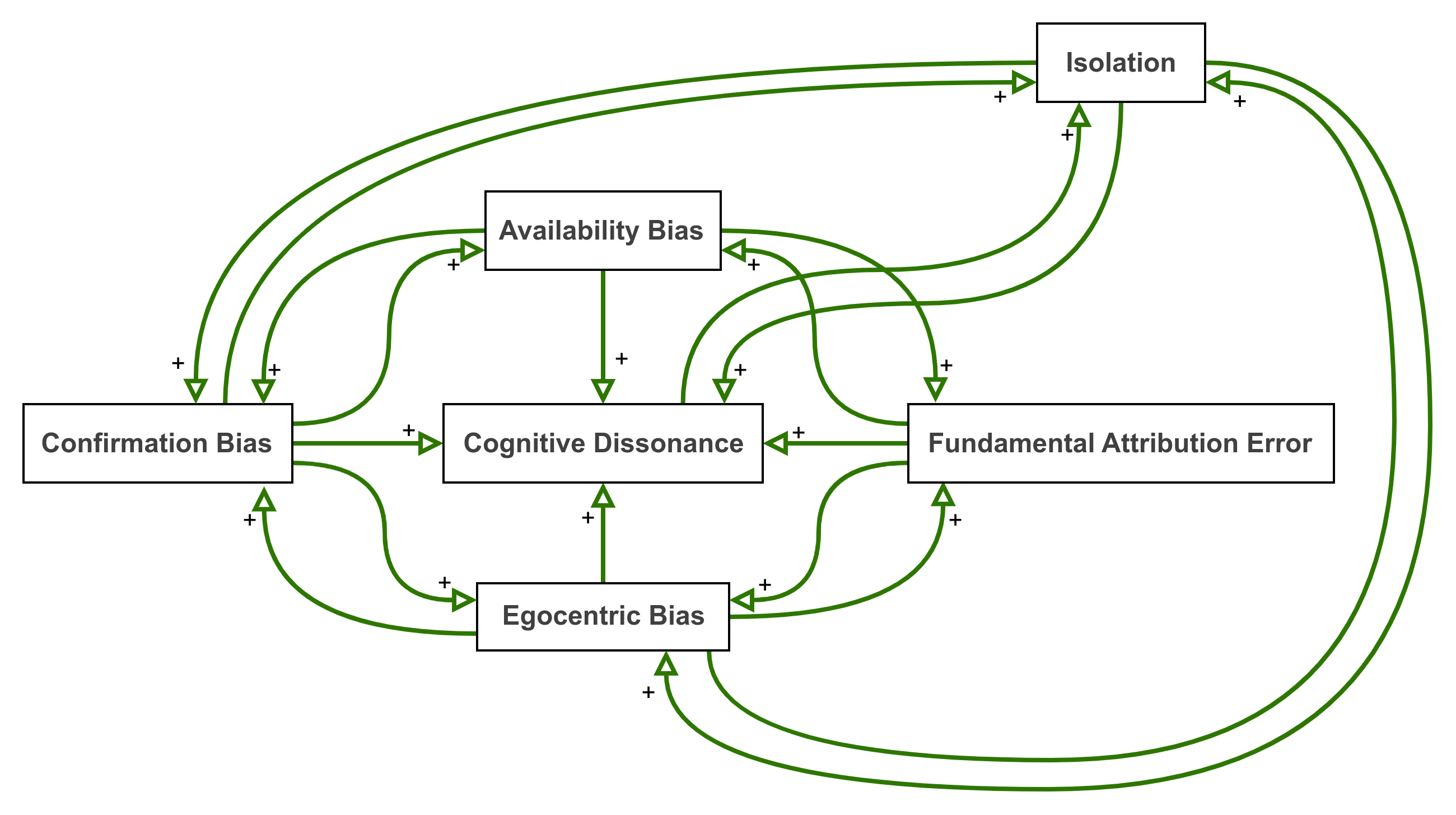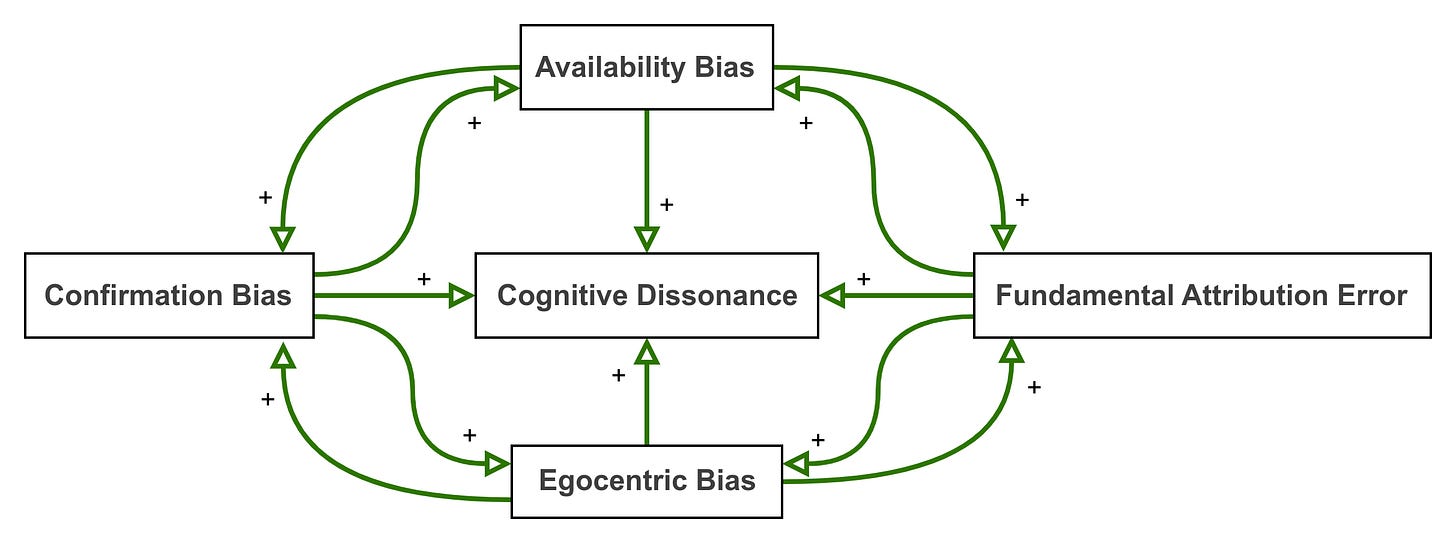 The effects of each of these biases on cognitive dissonance is more than cumulative. The effects augment each other, combining in ways that are much more significant than the impact of any single bias. Each bias can also reinforce the negative influences of other biases. The causal loop picture of just a few of the potential permutations looks like this: