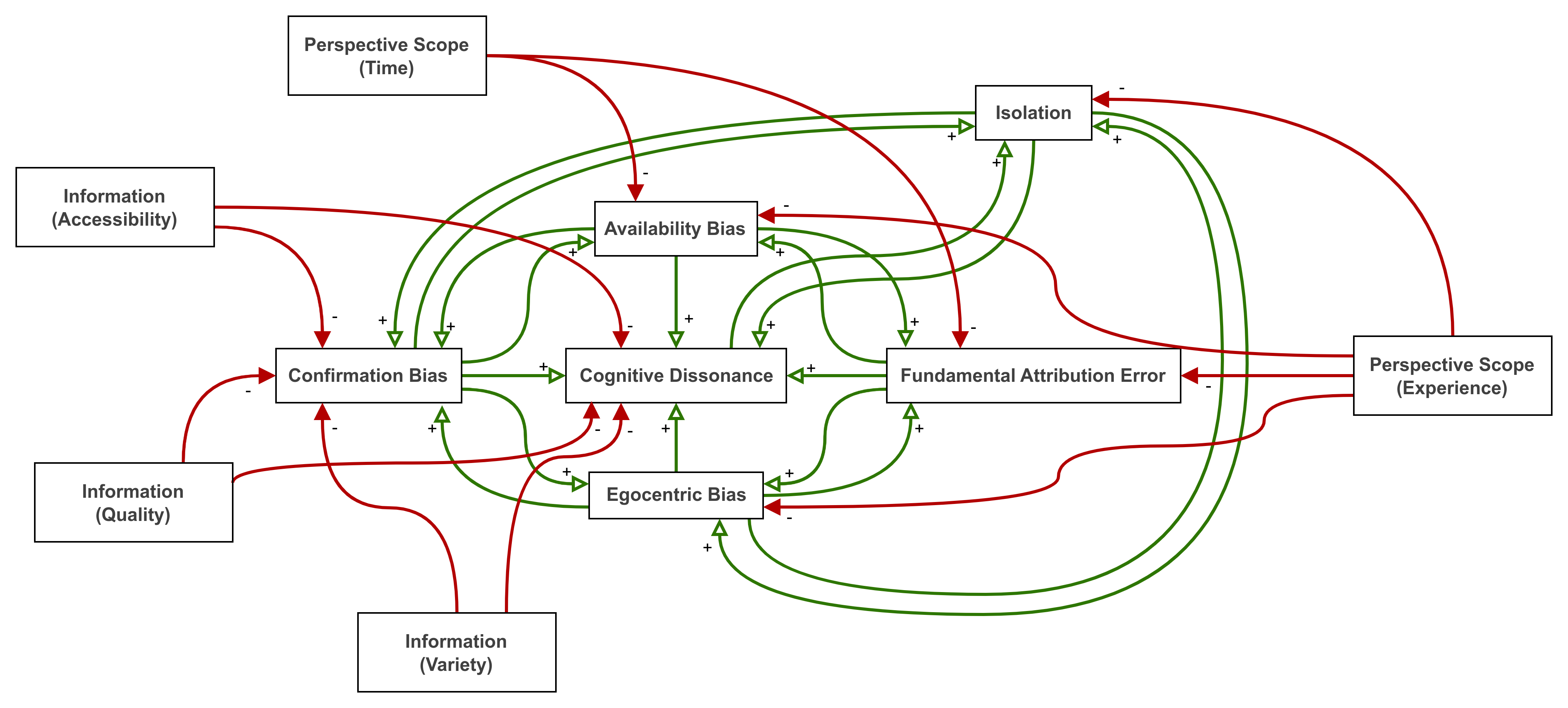 Each of the areas of focus listed above have the effect of reducing confirmation bias, egocentric bias, availability bias, the fundamental attribution errors, and ultimately, cognitive dissonance. The corrective causal loop picture, then, looks like this: