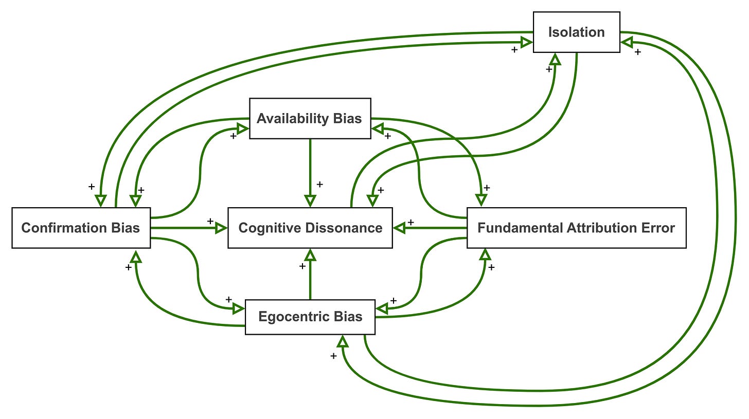 There are similar relationships between isolation and the availability bias and fundamental attribution error, but in my experience, these are lesser dragons and often sort themselves out when the bigger dragons are slain.