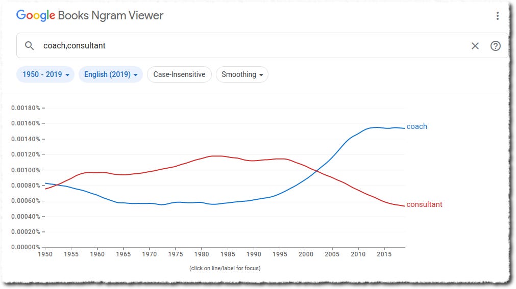 The coaching field is beyond saturated. Everyone is on the "I'm a coach" trolley. Maybe the coach trolley passengers put coin in the box so they can claim rights to a seat. Maybe they're freeloading on the coach-tails of everyone else and plan to ride for as long as it keeps moving along the track. The ubiquity of "coach" is replacing "consultant," as is its non-specificity and blandness.
