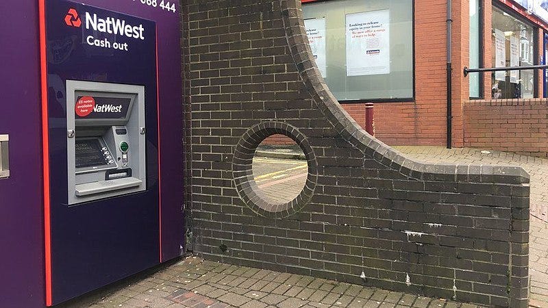 The NatWest Hole is on the far end of the continuum of things we can make fun of. The wall doesn’t care it’s a wall and the hole doesn’t care it’s a hole. It is us who care and in the case of the NatWest Hole, it’s safe to amplify and mock what it’s come to represent.