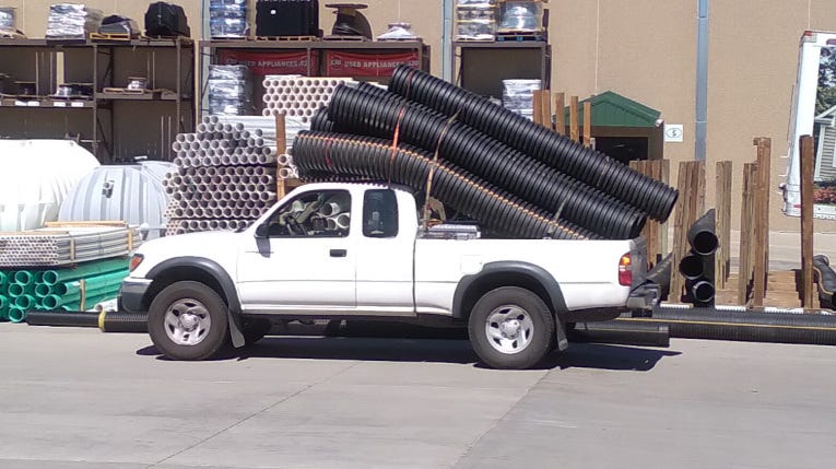 Actually, posting has been light and will be for a week or two more as I upgrade the home InterTubes bury these monsters as part of the flood mitigation plan drafted after a flooded basement this past June. A "100 year flood" plan, say the expensive civil engineers. So far, it's a crew of one (me) sourcing the material, transporting it, excavating the trench, installing the culvert, and re-landscaping the damage along with reworking an inadequate sump pump in a cramped crawl space. I hope to live a long and healthy life, but not so long as to discover if this actually solves the problem.